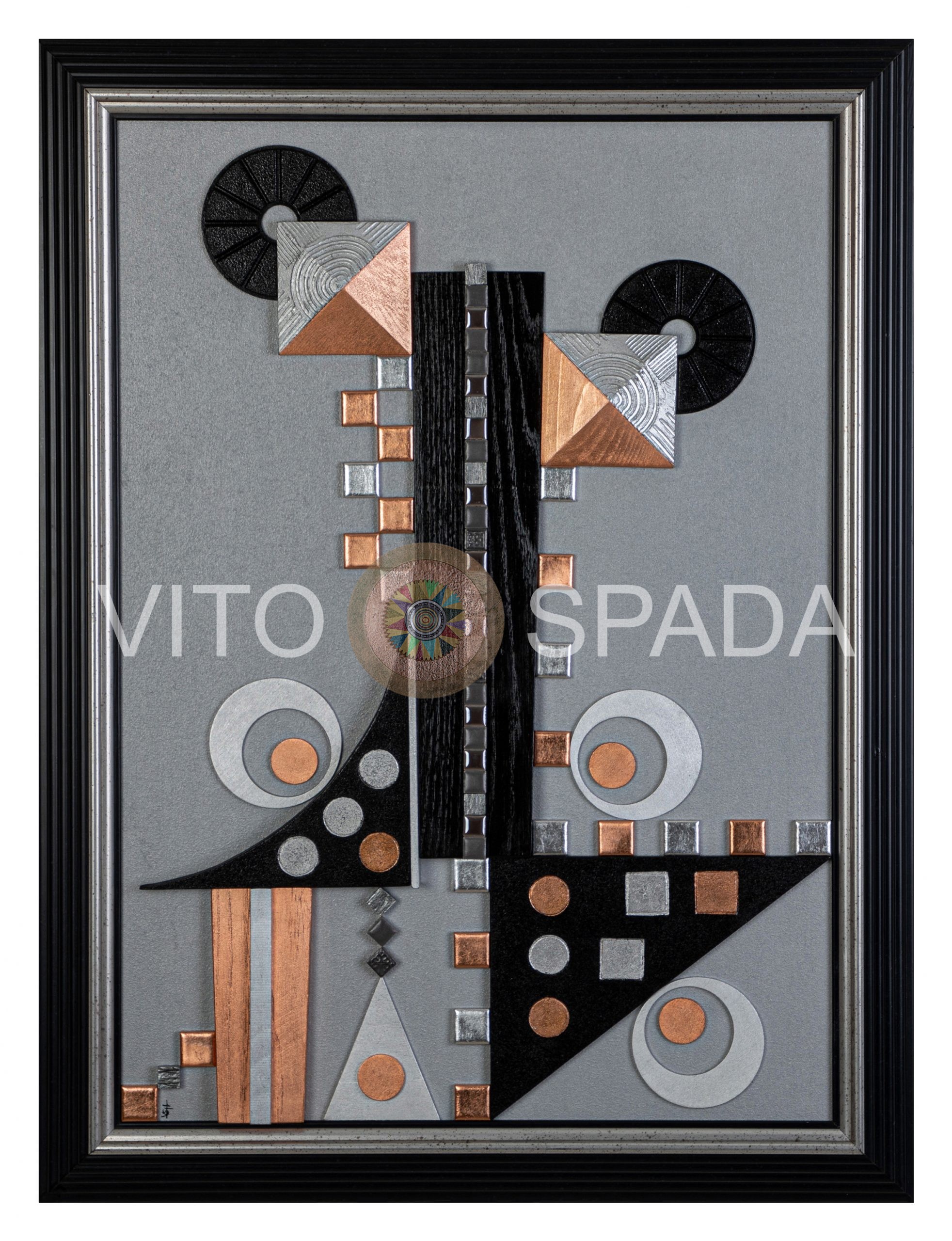 Scheda Opera GEOMETRIA MECCANICAPolimaterico, stucco, acrilico, foglio oro, rame, pezzi e listelli…